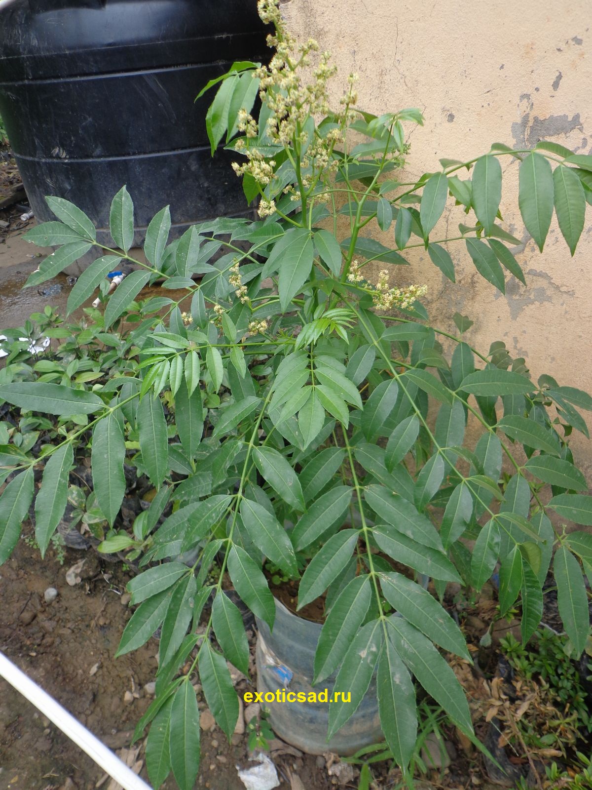 Невысокое, быстрорастущее дерево, листья 20-60 см длиной, с 9-25 ланцетовидными листочками. Цветки беловатые, собраны в метёлки.
