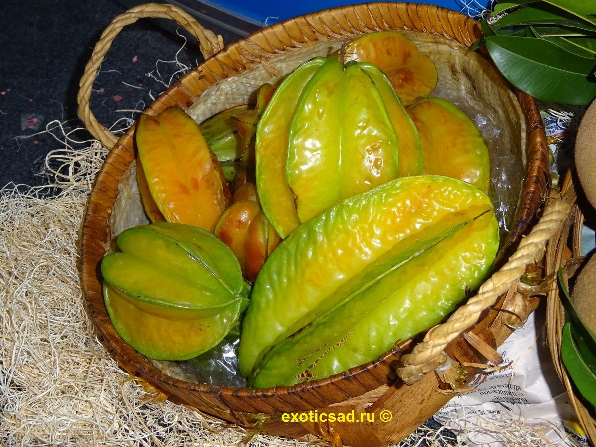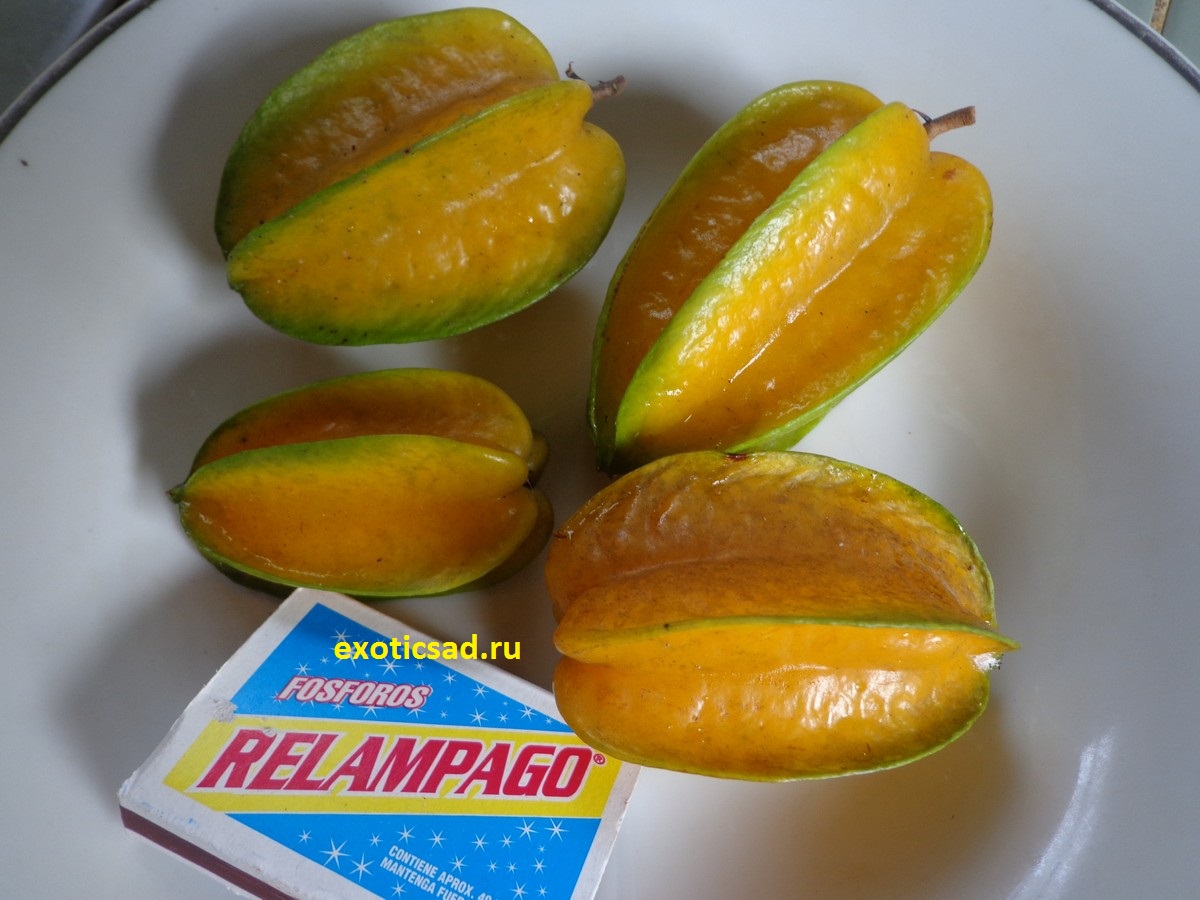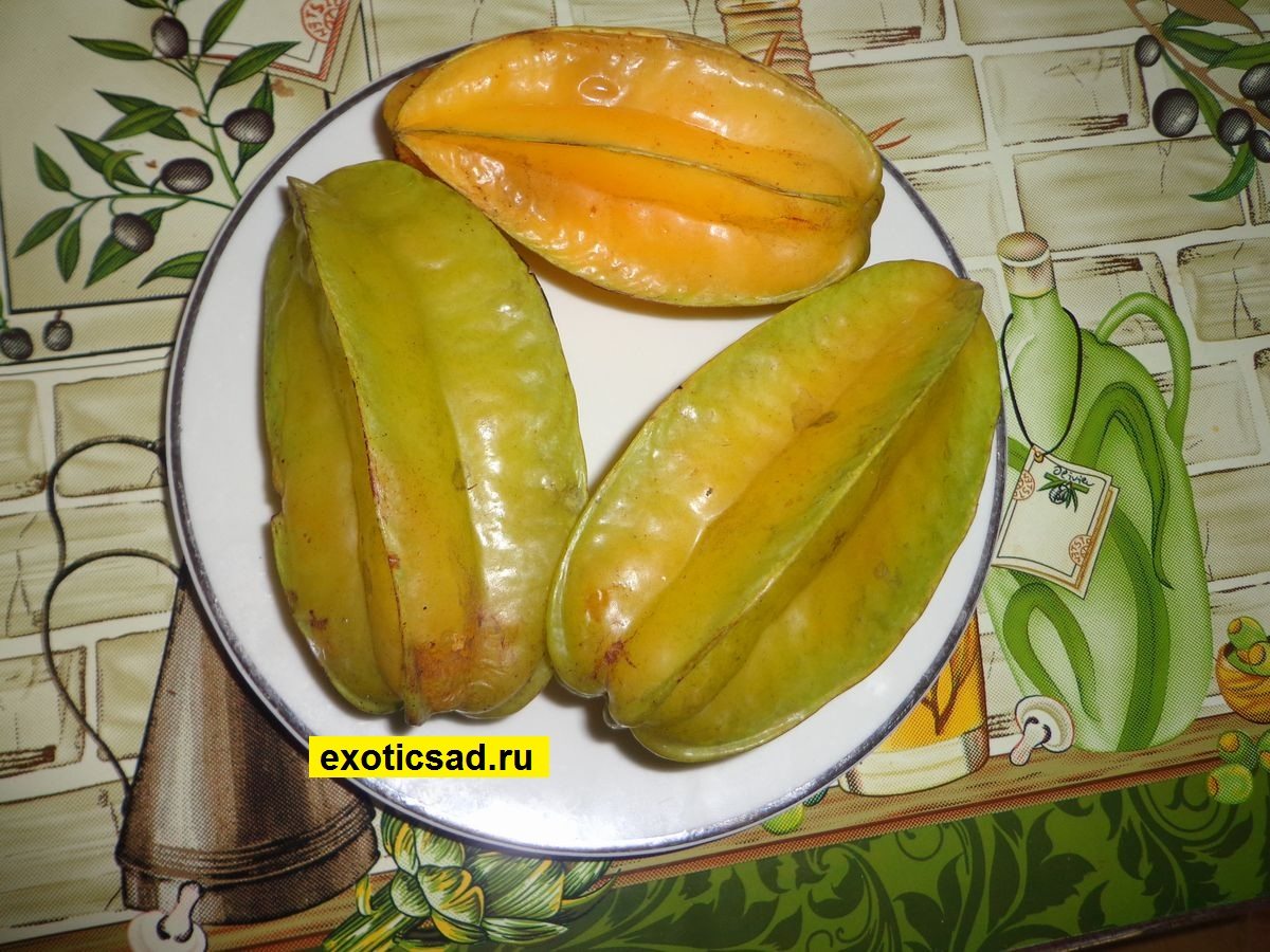 Плоды карамболы называют "звёздами", они жёлто-оранжеватого цвета, ребристые, на срезе образуют пятиконечную звезду.