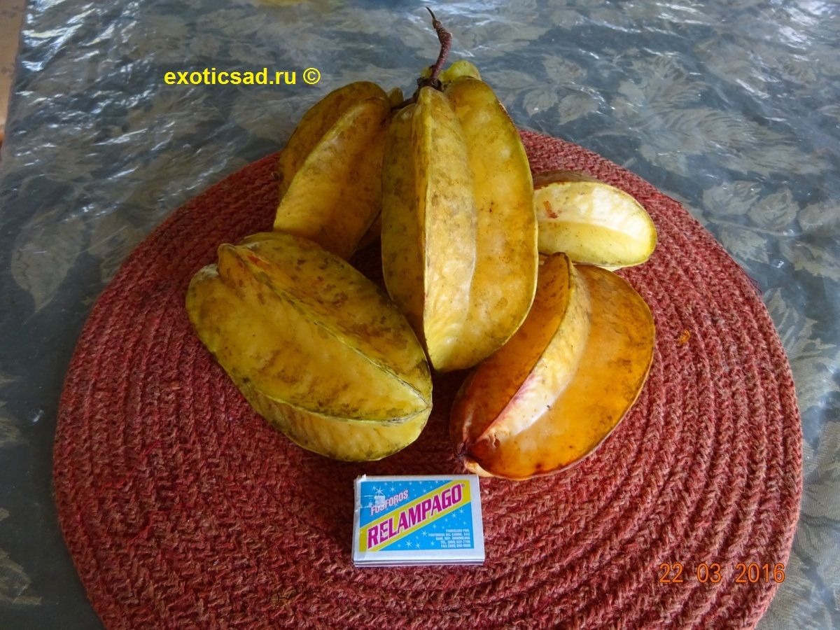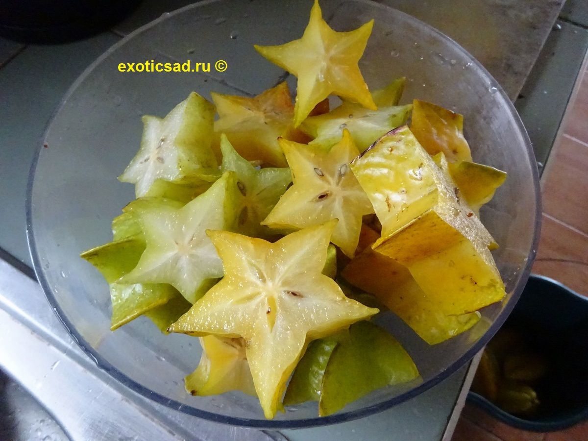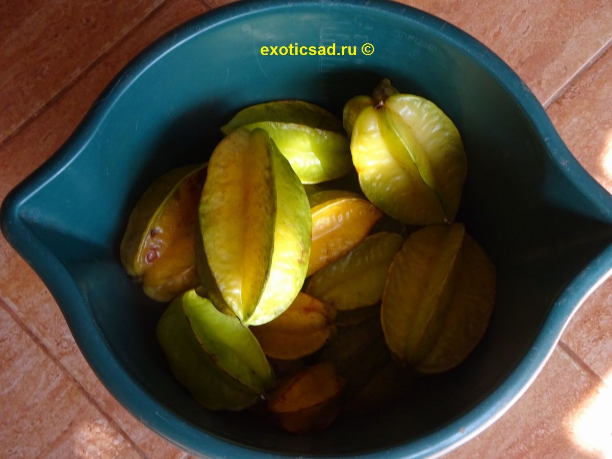 Плоды карамболы называют "звёздами", они жёлто-оранжеватого цвета, ребристые, на срезе образуют пятиконечную звезду.