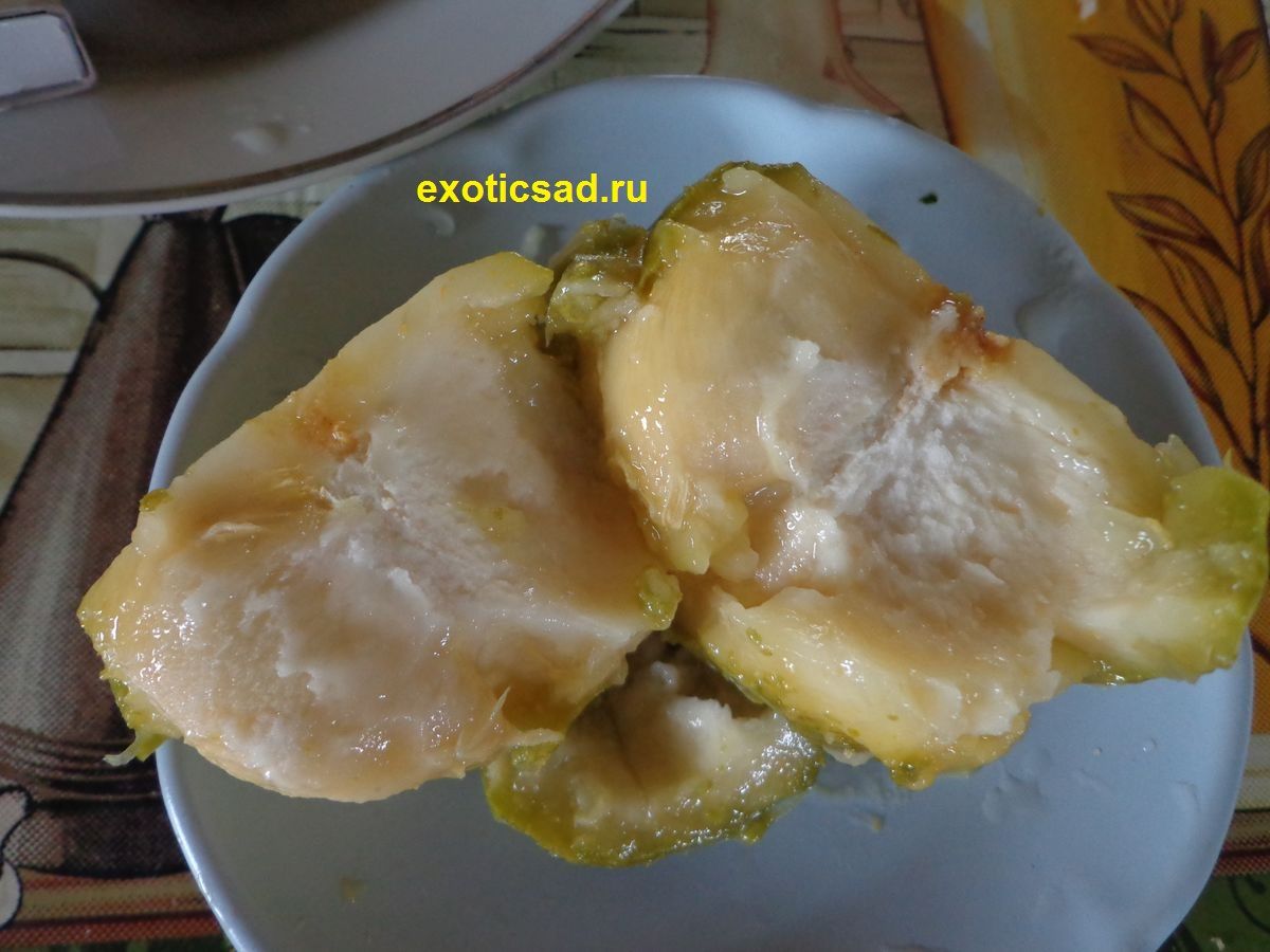Мякоть сливочно-белая, очень сладкая, сочная, маслянистая с 1-6 крупными белыми семенами.