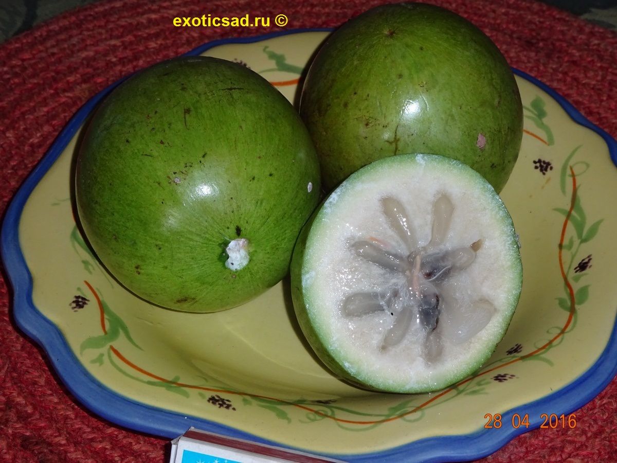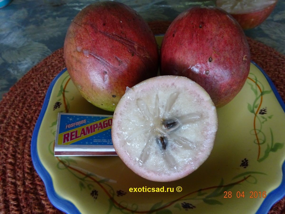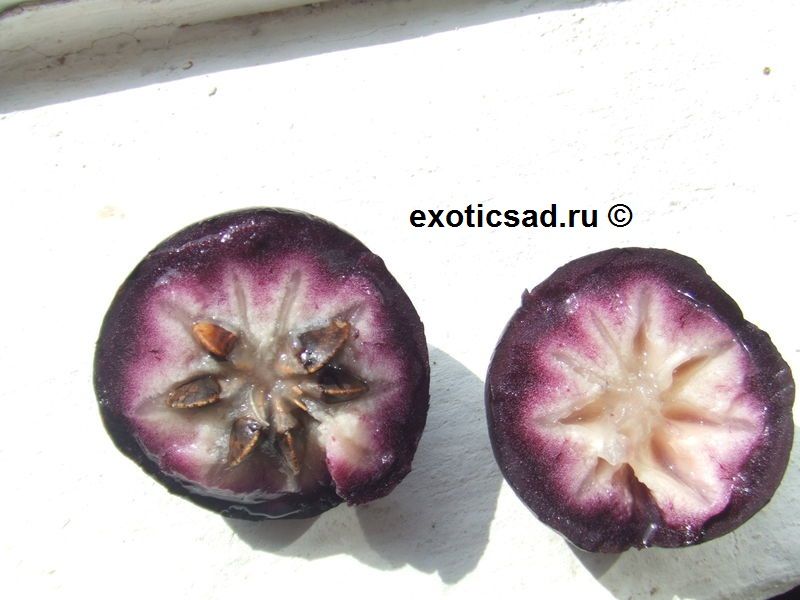 Мякоть сочная, белая, очень сладкая. Семян - 8 штук. Они образуют на срезе плода характерный "звёздчатый" рисунок.