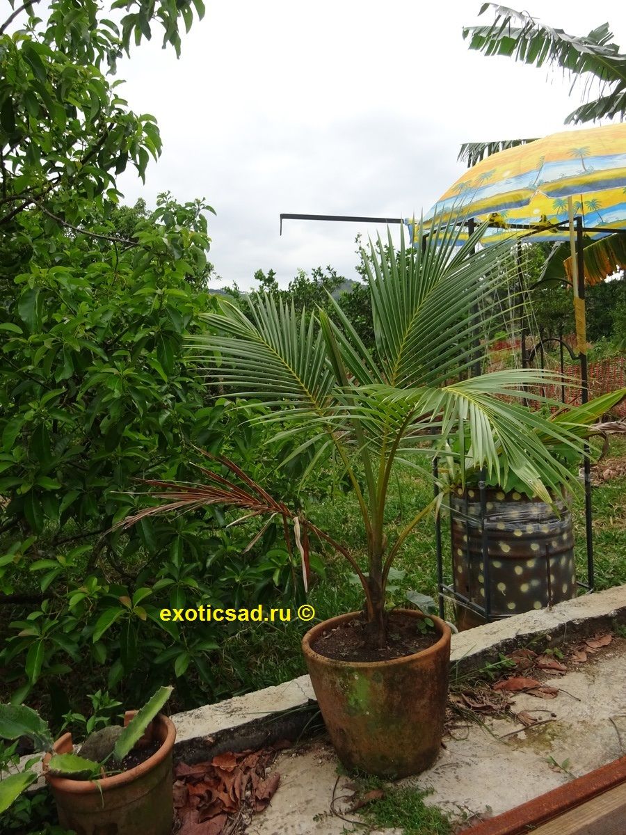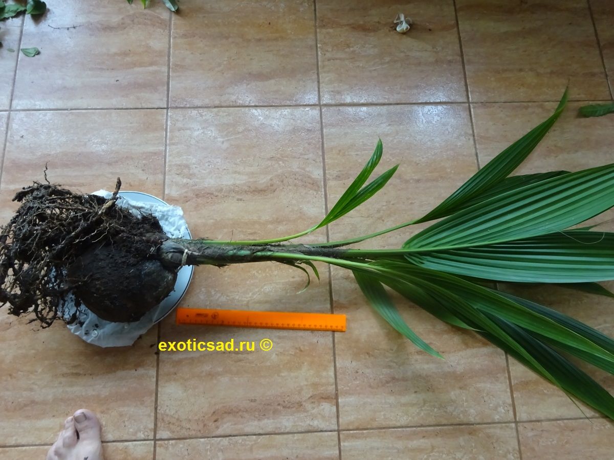 Для комнатной или оранжерейной культуры следует подбирать карликовые сорта, но и в этом случае контейнер должен быть на 30-40 литров, а лучше всего посадить пальму в грунт зимнего сада. Растёт и развивается пальма быстро.