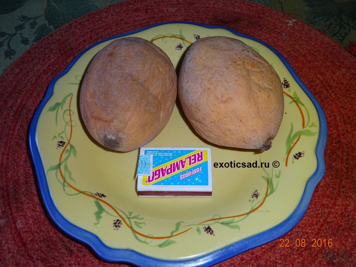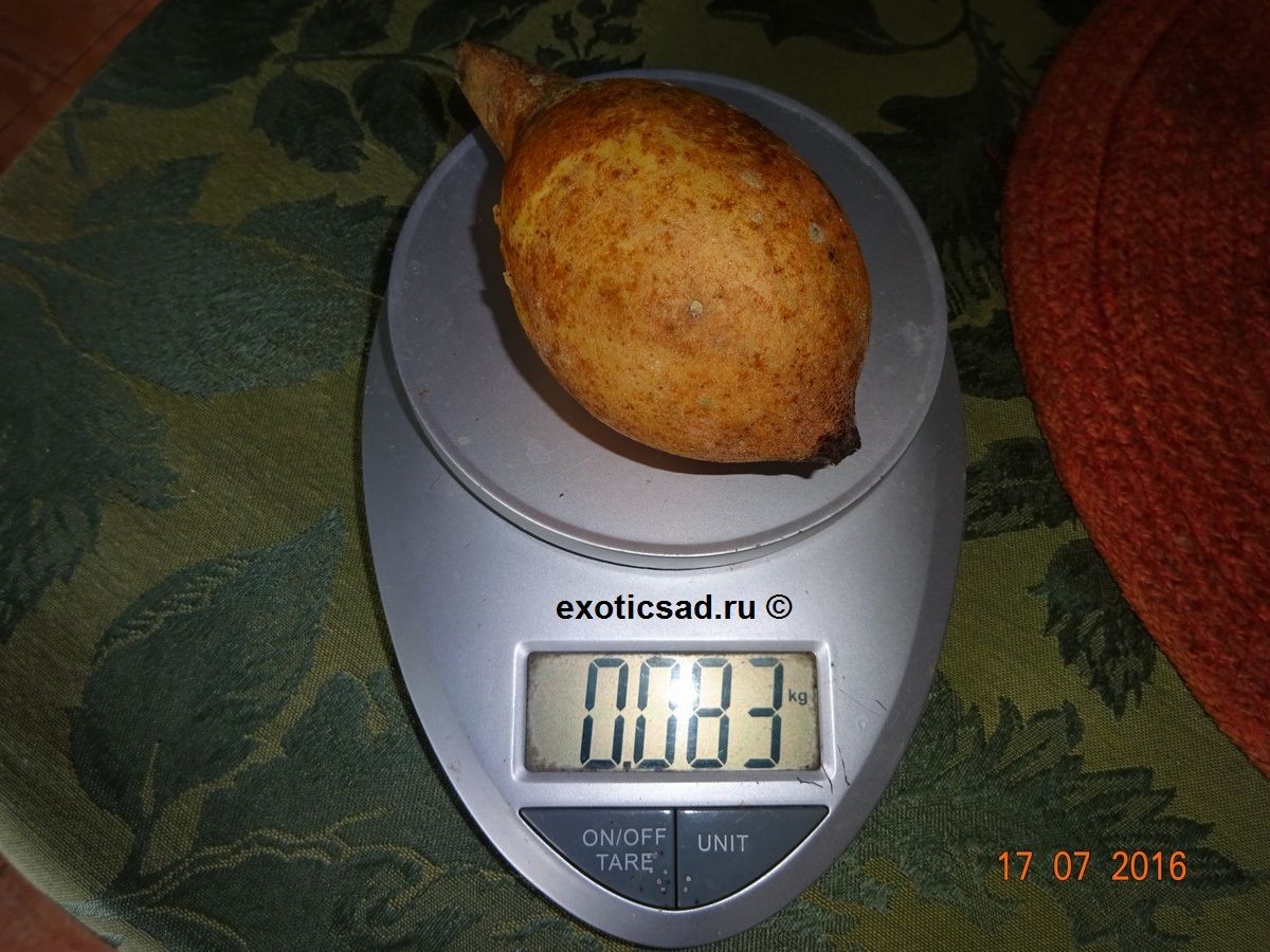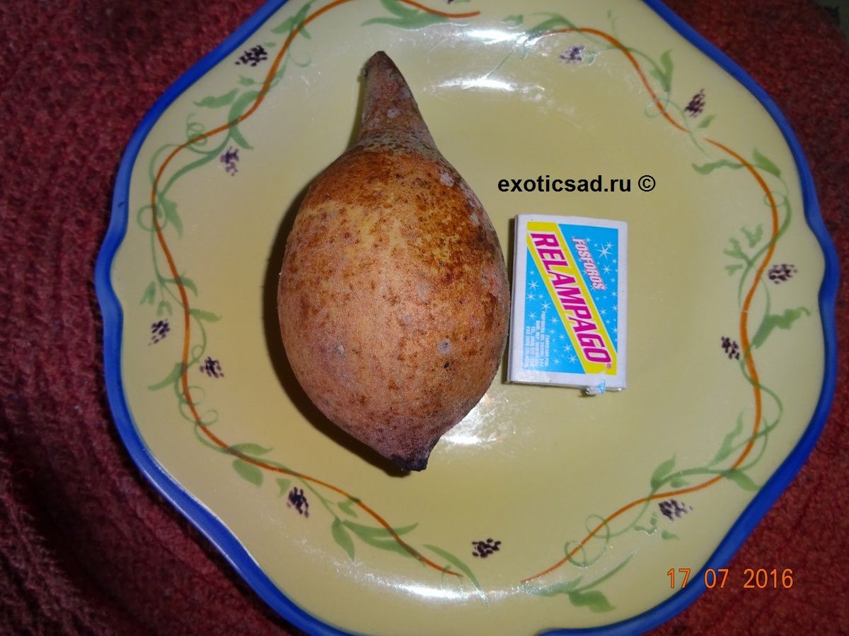 Плод генипы - овально-грушевидный или округлый, до 10-20 см длиной, с жёлто-коричневатой кожицей и беловатой мякотью.