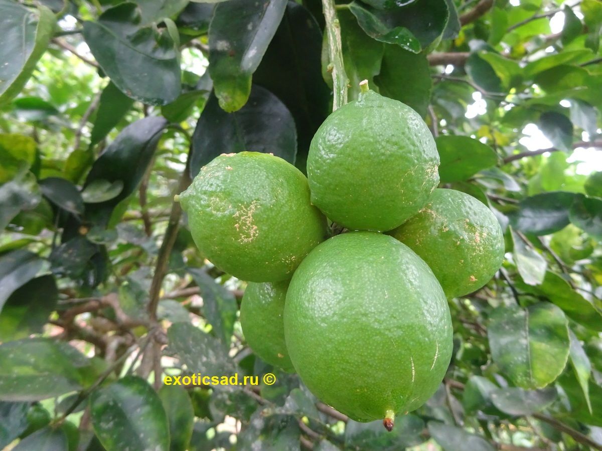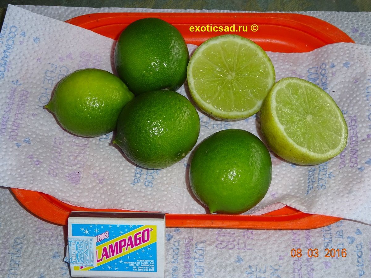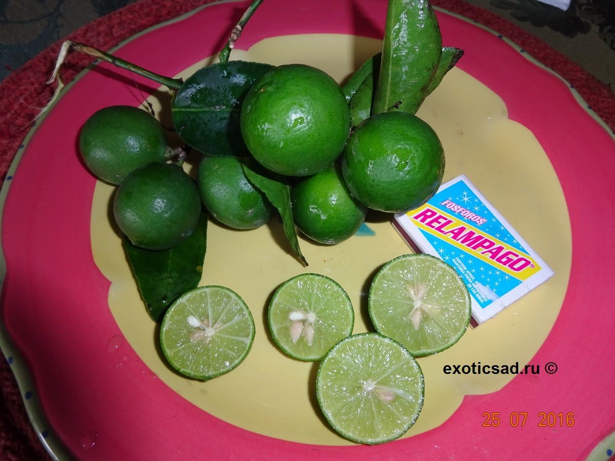 Плоды лайма - от 4 до 6 см в диаметре, яйцевидные, с зеленоватой, сочной, кислой мякотью.