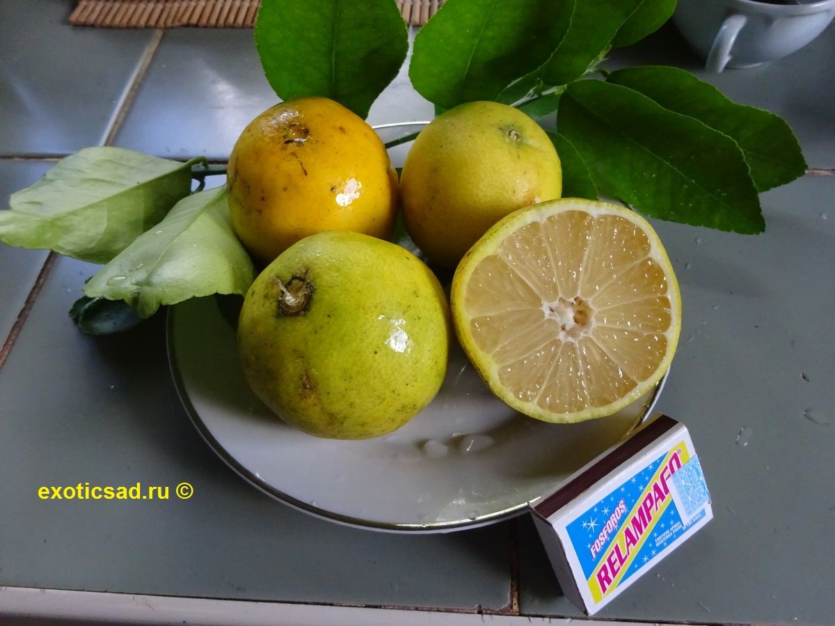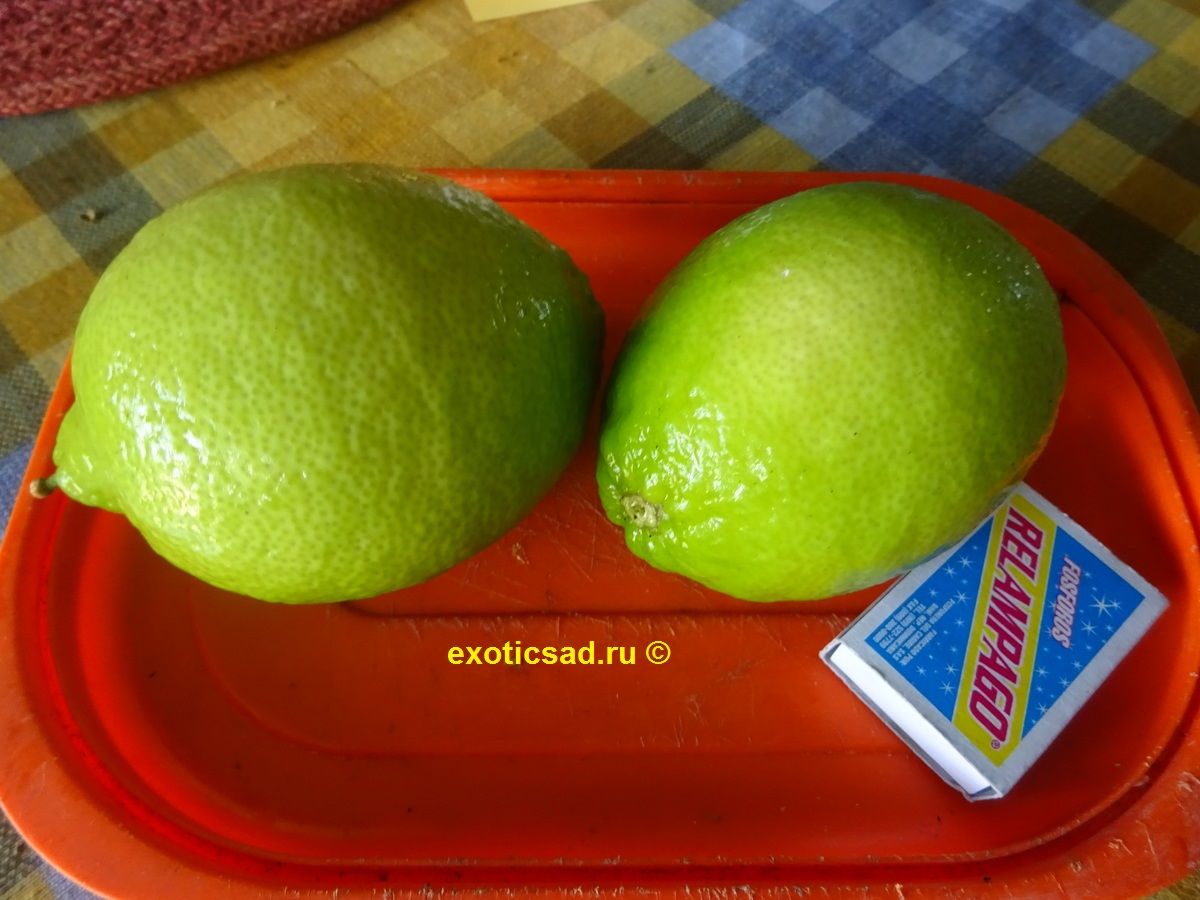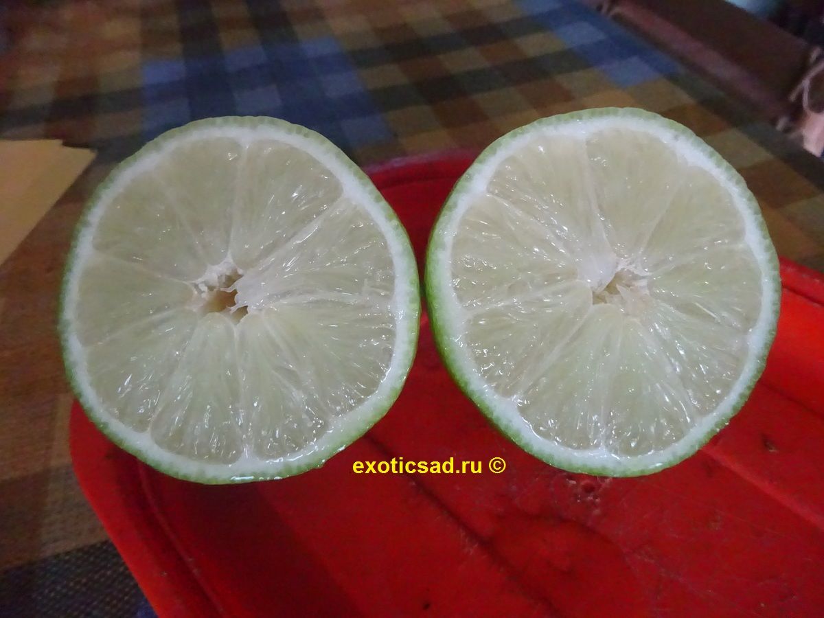 Плоды лайма - от 4 до 6 см в диаметре, яйцевидные, с зеленоватой, сочной, кислой мякотью.