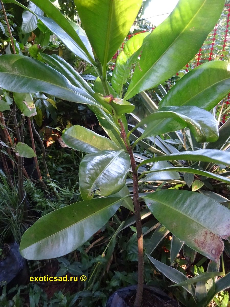 Деревце маммеи американской имеет крупные, глянцевые, кожистые листья длиной до 20 см и шириной до 10 см.