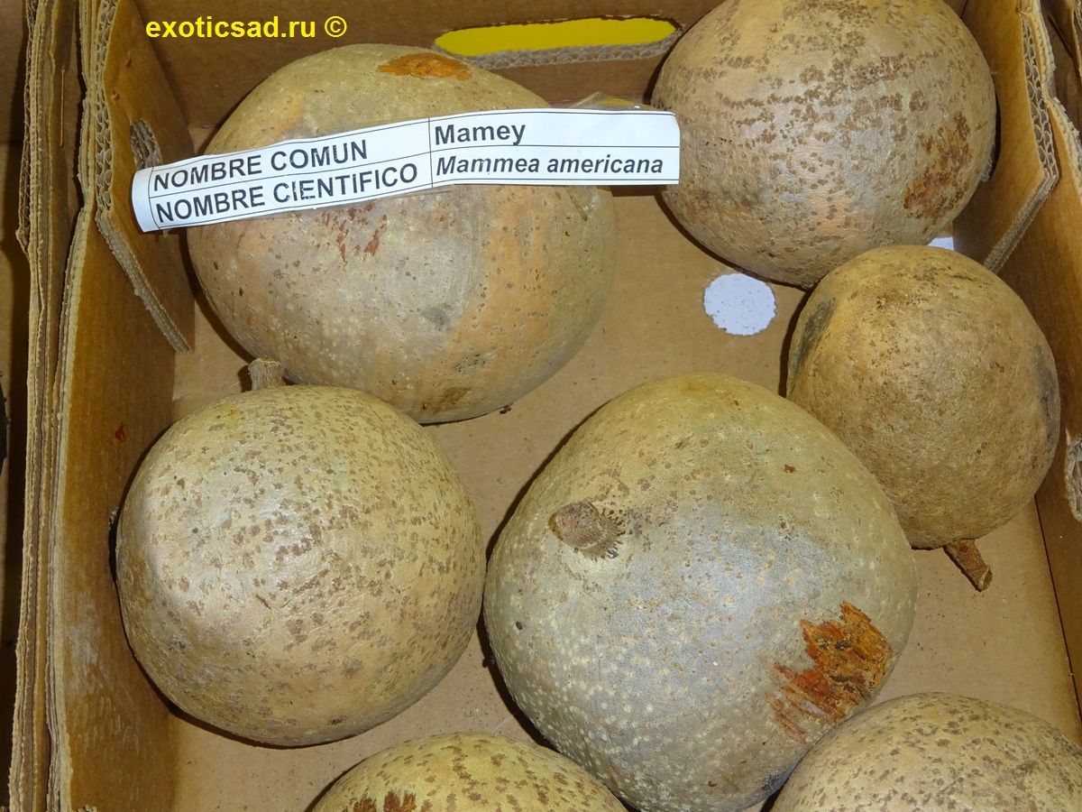 Плоды у маммеи крупные, до 20 см в диаметре, покрыты жёсткой серой кожицей. Плод содержит 2-3 крупных семени.