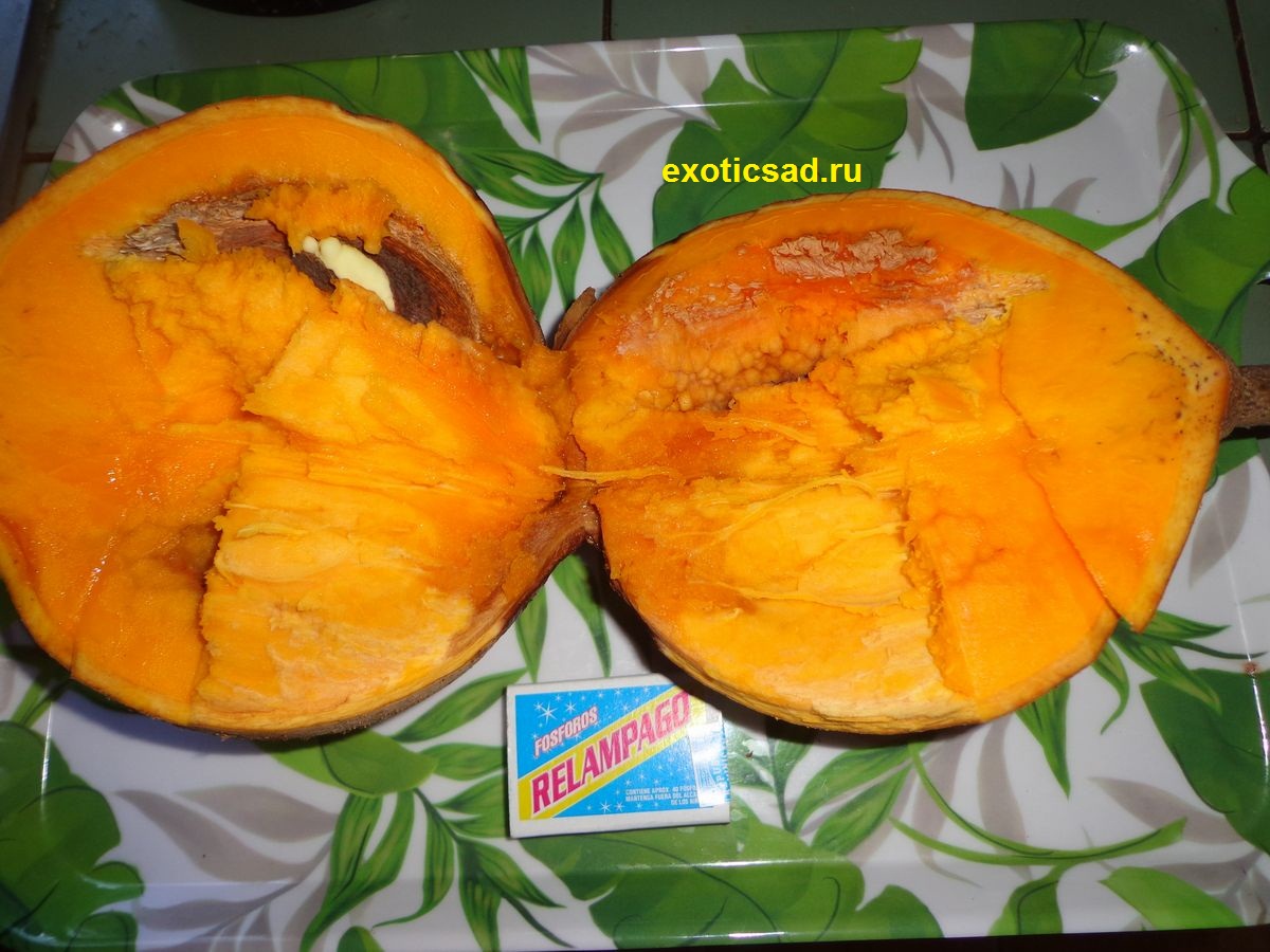 Мякоть оранжевая, сладкая, напоминающая по вкусу абрикос.