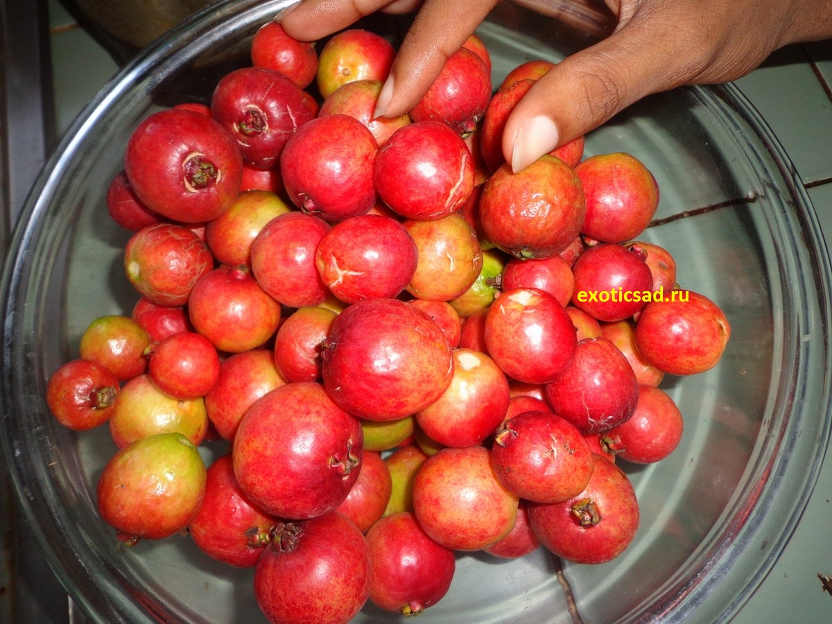 Плоды у гуавы земляничной - округлые или грушевидные 3-4 см диаметром, с тёмно-красной или вишнёвой кожицей.