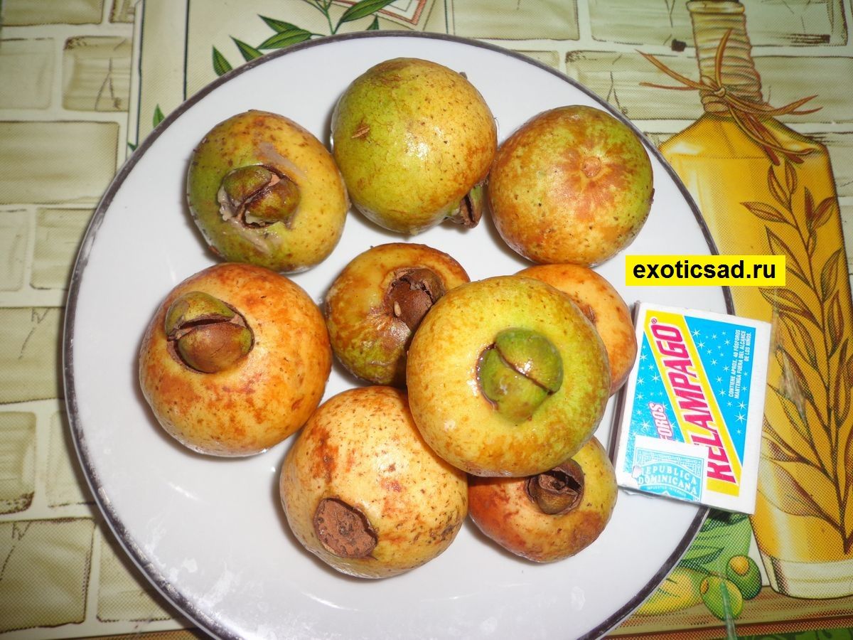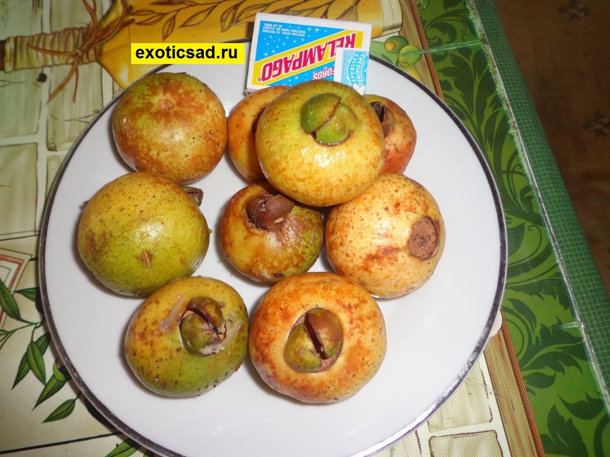 Плоды - округлые зеленовато-жёлтого цвета с коричневыми пятнами при созревании. Кожура плода плотная.