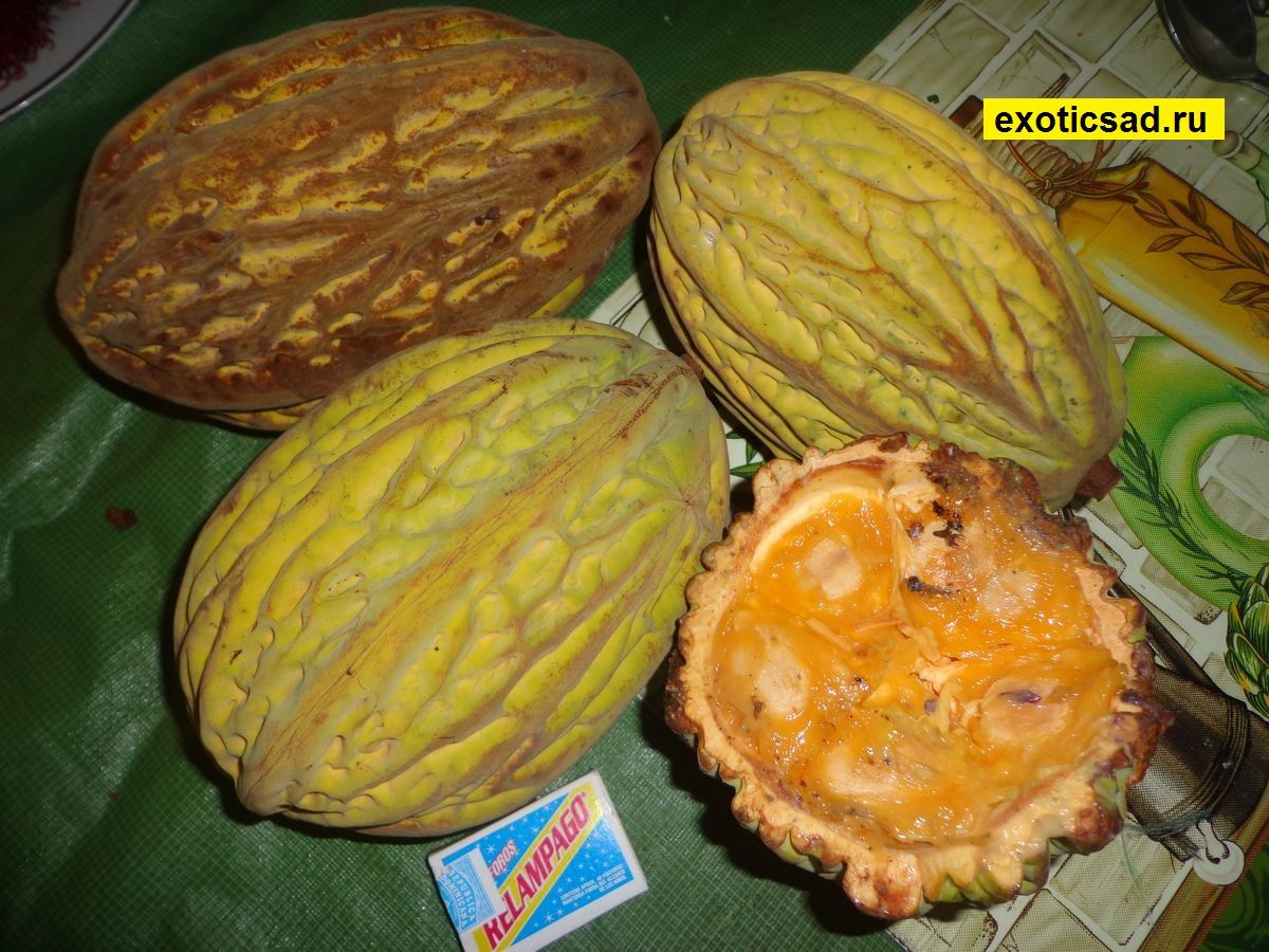 Плоды у какао белого - эллипсовидной формы, крупные, от 0,5 до 3 кг весом, кожура плода от беловато-зелёного до кремово-желтоватого цвета,