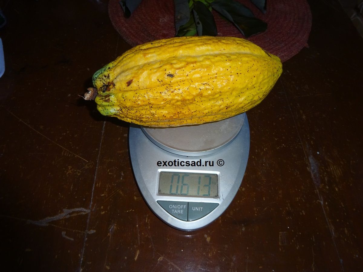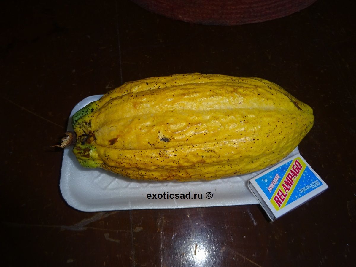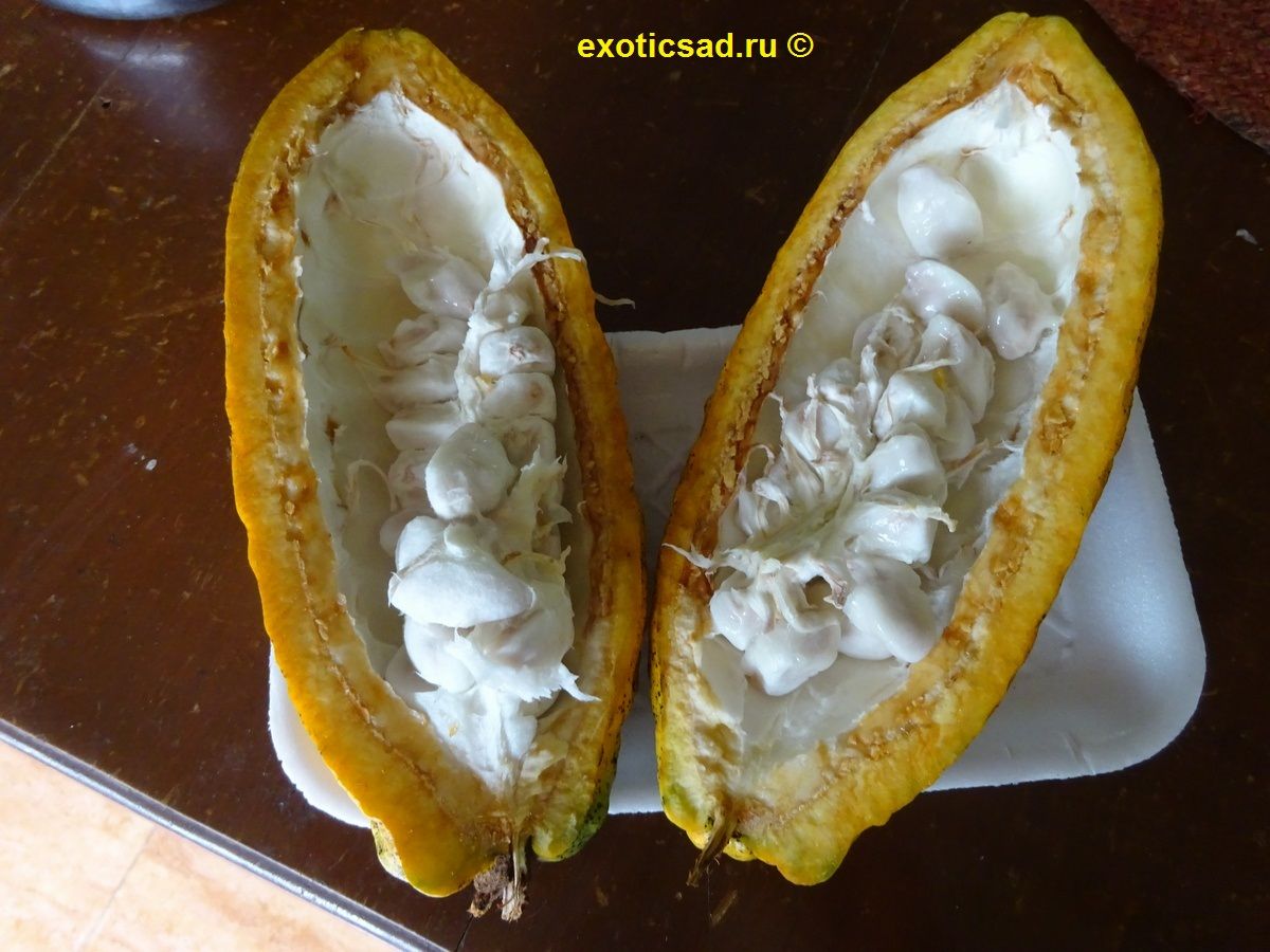 Содержит 20-60 крупных семян (какао-бобы), окружённых белой, съедобной, кисловато-сладкой мякотью.